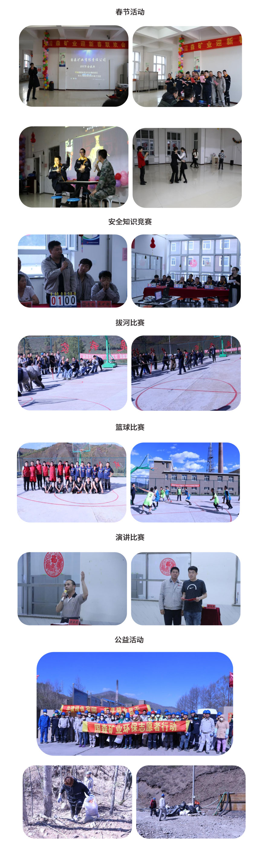 文化活動:在節(jié)日期間,在員工工作之余,公司組織豐富多彩的文體活動,豐富員工業(yè)余生活,增強員工團隊意識和凝聚力;組織安全知識競賽及安全培訓(xùn),不斷提高員工安全風(fēng)險意識,規(guī)避風(fēng)險技能大大增強;開展“我愛礦山”“綠水藍天”環(huán)保公益活動等,積極參加綠色礦山建設(shè)。組織車間開展技能比武活動、演講比賽,提高員工自身技術(shù)素質(zhì)。